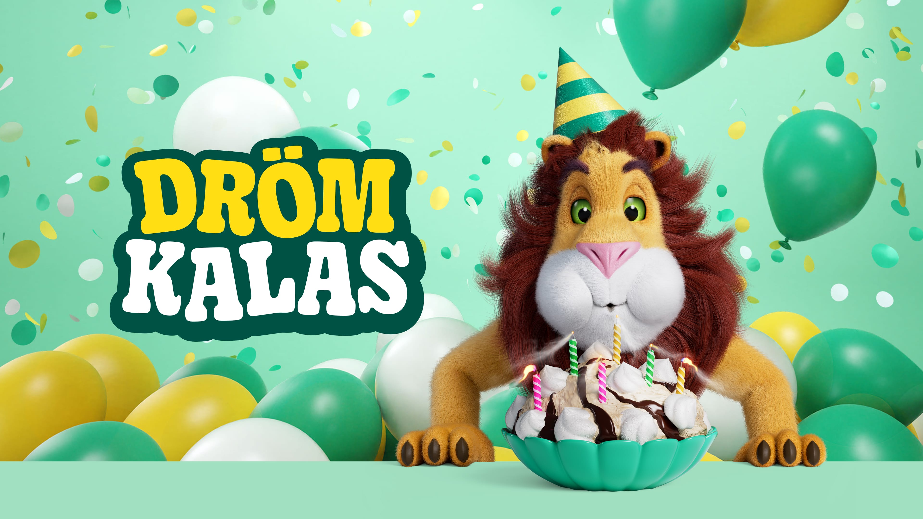 Our Drömkalas communication concept should be colorful, festive, and full of joy. Always show Leo in full party mood together with happy party kids to strengthen the feeling of celebration. Use light green as the lead color, balloons and cheerful elements to create a magical, dreamlike atmosphere.